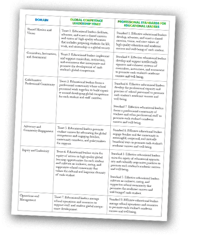The seven tenets of globally competent educational leadership are aspirational, not prescriptive. They are a gold standard for what educational leaders have the potential to achieve, no matter their level of experience or expertise in this area. Furthermore, they are meant to integrate with, not added onto, the professional standards and best practices to which educational leaders already adhere to support students’ academic success and overall well-being. As such, they directly align with the Professional Standards for Educational Leaders, specifically the domains of mission, vision, and core values; equity; curriculum, instruction, and assessment; community of care and support for students; professional capacity of school personnel; professional community for teachers and staff; meaningful engagement of families and community; and operations and management.